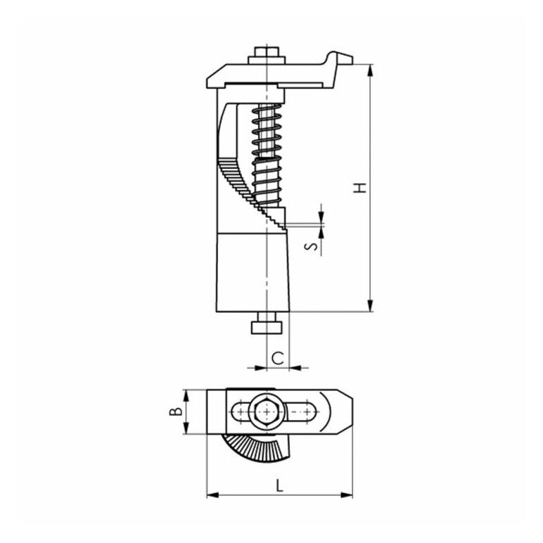 Spezialguss, Schraube und Gewindehülse 8.8 · Anwendung: Diese Stufenpratze ist als Spanneinheit schnell einsatzbereit. Die Feinabstufung der Rastentreppe ermöglicht ein schnelles Anpassen an jede Werkstückhöhe bis zu ca. 320 mm. Durch die kompakte Bauweise benötigt die Stufenpratze wenig Platz auf dem Maschinentisch Weitere technische Eigenschaften: · S: 2,5mm · C: 21mm · L: 125mm · B: 50mm · H: 50 - 120mm