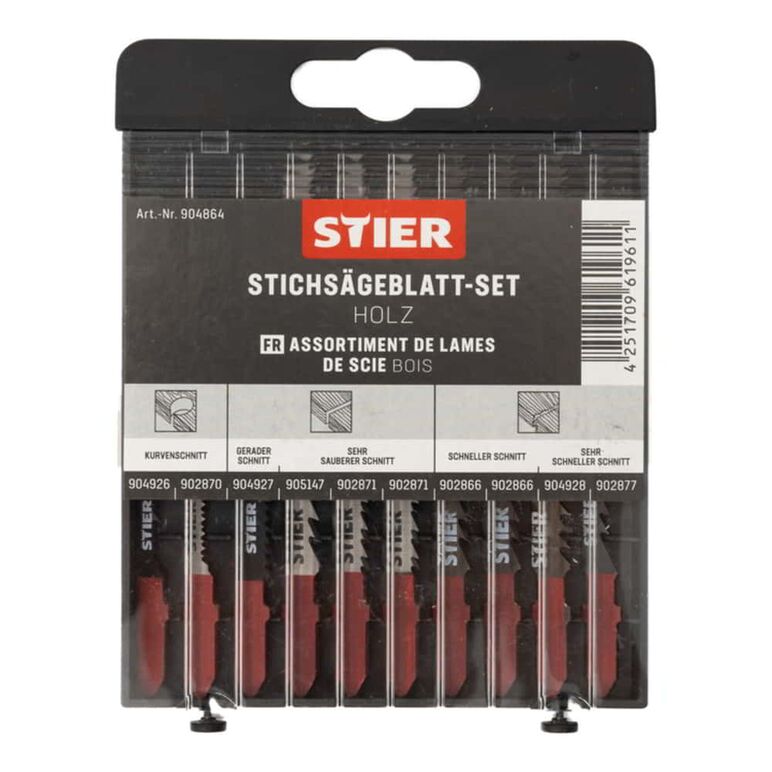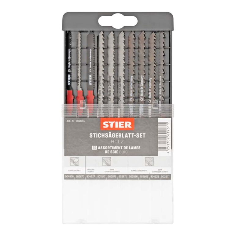 Das STIER Stichsägeblatt-Set für Holz bietet dem Anwender eine Auswahl an hochwertigen und bewährten STIER Stichsägeblättern an.Eigenschaften:Aus hochwertigem Chrom-Vanadium-Werkzeugstahl gefertigtFür schnellen und sauberen SchnittJe nach Anwendungszweck geeignet für geraden Schnitt, Kurvenschnitt sowie rauen SchnittAnwendungsgebiete:Zum Sägen von verschiedenen Werkstücken aus Holz und Holz-Bestandteilen wieWeich- und KonstruktionsholzSperrholzMDFMultiplex- und TischlerplattenKüchenarbeitsplattenHartholzLieferumfang:1 x STIER Stichsägeblatt ST 60/2/1,25 Holz (Artikel-Nr. 904926)1 x STIER Stichsägeblatt ST 75/2/1 Holz (Artikel-Nr. 904927)1 x STIER Stichsägeblatt ST 75/3/1,25 Holz (Artikel-Nr. 904928)1 x STIER Stichsägeblatt ST 75/4/1,25 Holz (Artikel-Nr. 902877)2 x STIER Stichsägeblatt ST 75/4/1,25 Sperrholz (Artikel-Nr. 902866)1 x STIER Stichsägeblatt ST 50/1,3/1,25 Holz (Artikel-Nr. 902870)2 x STIER Stichsägeblatt ST 75/2,5/1,45 Holz (Artikel-Nr. 902871)1 x STIER Stichsägeblatt ST 75/4/1,7 Holz (Artikel-Nr. 902879)STIER-Produkte werden von Profis aus Handwerk und Industrie entwickelt und verbinden in höchstem Maße Leistungsstärke und Ergonomie. Kraftvoll. Widerstandsfähig. Langlebig. Tausende Kunden vertrauen dem besten Preis-Leistungs-Verhältnis. Erlebe auch du die STIER Produktpalette auf unserer Markenseite .
