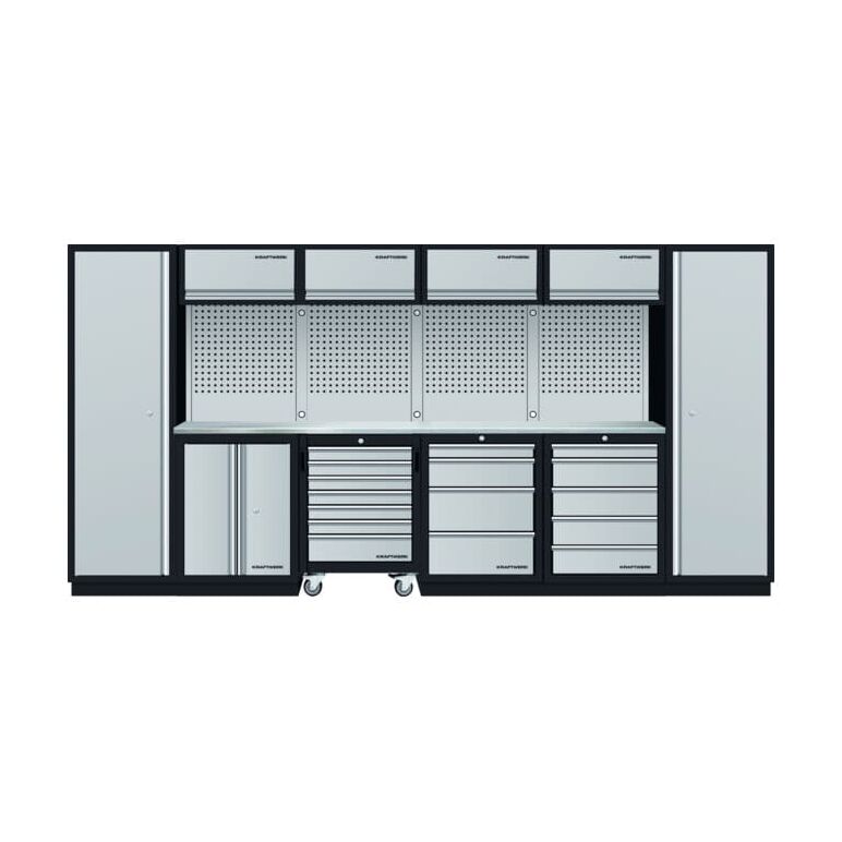 - Der Arbeitsplatzbereich ist mit zwei 38 mm starken Edelstahl Arbeitsplatten ausgestattet.1 Arbeitsplatzschrank mit 5 Schubladen.1 Arbeitsplatzschrank mit 4 Schubladen