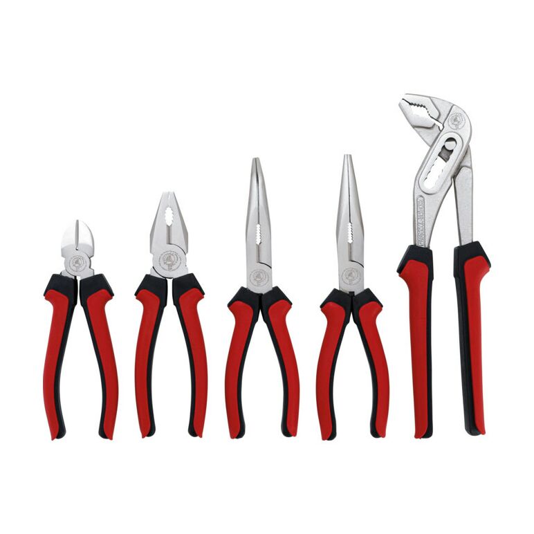 Eigenschaften:Alle Zangen mit schwerer 2-Komponenten-HandschutzisolierungLieferumfang:1 Kombizange, 175 mm1 Schwedischer Seitenschneider, 165 mm1 Telefonzange, gerade, 200 mm1 Telefonzange, gebogen, 200 mm1 Wasserpumpenzange, 240 mm, durchgestecktes Gewerbeim Kunststoffkoffer