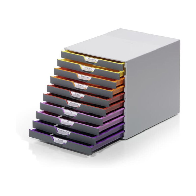 - Feine Farblinien dienen bei geschlossenen Schubladenfronten als Organisations- und Orientierungshilfe, mit beiliegenden transparenten Beschriftungsfenstern und computerbeschriftbaren, leicht auswechselbaren Einsteck-Etiketten