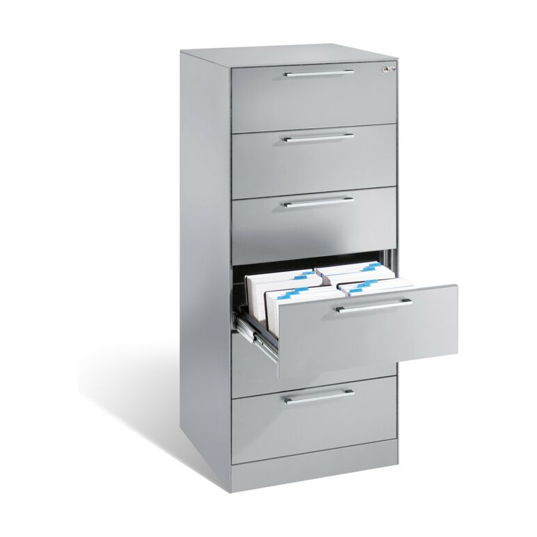 - 1x C+P Karteischrank Asisto für Karteikarten DIN A5 quer, 6 Schubladen, zweibahnig Front Lichtgrau Korpus Lichtgrau