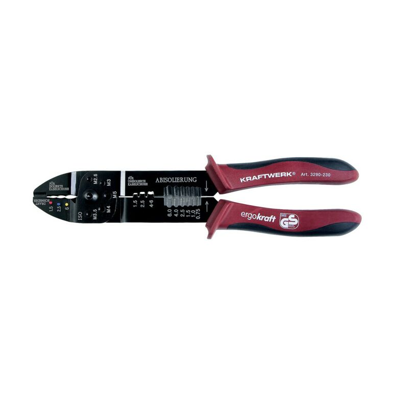 Eigenschaften:Ergokraft Abisolier- und Kabelschuhzange 5-in-1, Kraftwerk 3290-230Kombi-Abisolier und Kabelschuhzange gehärtet und mit geschliffenen Schneiden für professionelle und industrielle Anwendungen