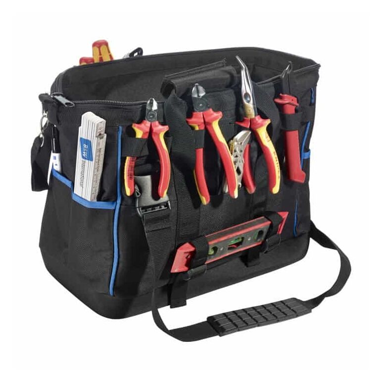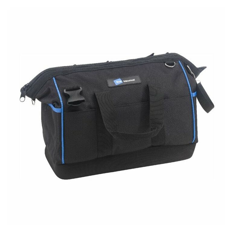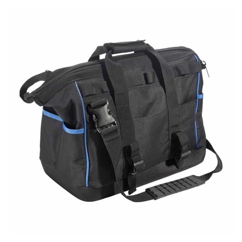• Robuste Werkzeugtasche mit flüssigkeitsabweisendem Boden, robustem Reißverschluss und gepolstertem Schultergurt