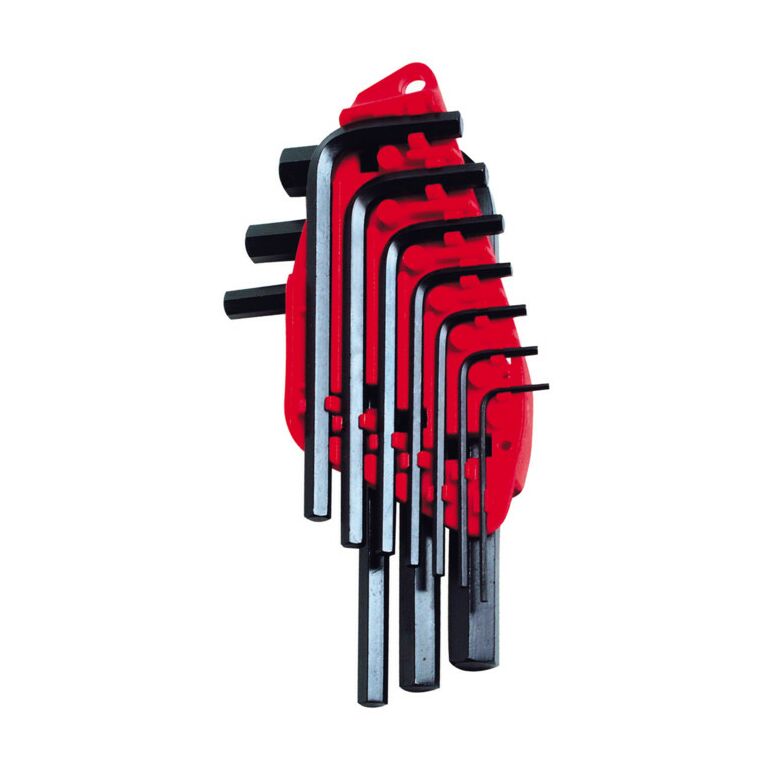 Eigenschaften:Stiftschlüssel-Set im Halter, Kugelkopf-Ausführung, 10-teiligSilizium-StahlAusführung: phosphatiertGrößen: 1,5-2-2,5-3-4-5-5,5-6-8-10mm