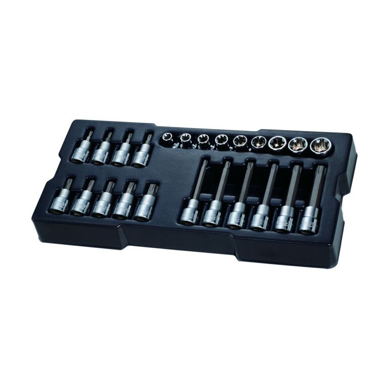 Eigenschaften:Teil des TransModul Werkstattwagen SystemsSteckschlüssel: Maxi-Drive Profil: greift an den Flanken, nicht an den Ecken – optimale Kraftübertragung und höhere Haltbarkeit, Chrom-Vanadium StahlBit-Steckschlüssel: S2 Stahl Bits, 60 HRC (Härte nach Rockwell) +/-2 - bis zu 20% höheres Drehmoment, als Chrom-Vanadium StahlLieferumfang:9 Torx Bit-Steckschluessel: T20, T25, T27, T30, T40, T45, T50, T55, T606 Torx lange Bit-Steckschluessel: T30, T40, T45, T50, T55, T609 Torx Steckschluessel: E10, E11, E12, E14, E16, E18, E20, E22, E24