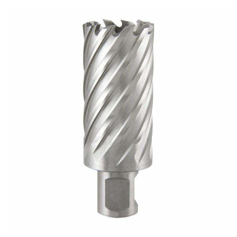 EigenschaftenKernbohrer aus kobaltlegiertem Hochleistungs-Schnellarbeitsstahl mit höherer WarmhärtebeständigkeitIdeal zum Bohren von schwer zerspanbaren Werkstoffen und für höchste BeanspruchungGeeignet für die Bearbeitung von unlegierten und legierten Stählen (bis 1200 N/mm²), Warm- und Kaltarbeitsstähle, sowie für Vergütungs- und EinsatzstähleDurch eine weiterentwickelte Schneidengeometrie konnte ein deutlich verbessertes Schneidverhalten erreicht werden, welches sich positiv auf die Schneidleistung und Standzeit auswirkt+ Optimierte Schneidengeometrie für erhöhte Zerspanleistung und verringerte Schnittkräfte+ Die Spanwinkel sind für den universellen Einsatz in verschiedenen Stahlsorten ausgelegt+ Verbesserte Spanabfuhr durch U-förmige AuslückungDie spezielle Geometrie der Auslückung verringert die thermische Belastung des HSS-Kernbohrers, da die Wärme, welche bei der Zerspanung entsteht, weitestgehend mit dem Span abgeführt wird+ Verringerung der Reibung zwischen dem HSS-Kernbohrer und dem Werkstück durch optimierte, spiralförmig verlaufende FührungsfasenEinsetzbar in allen Säulen- und Magnetständerbohrmaschinen mit Morsekonus in Verbindung mit RUKO Aufnahmehalter Nr108 302 / 108 303 / 108 315 / 108 316, der RUKO EasyLock Nr108 312 / 108 313 / 108 314 oder mit Weldonschaftdirektaufnahme wie z.BRUKO Magnetständerbohrmaschine RS10 / RS40e.
