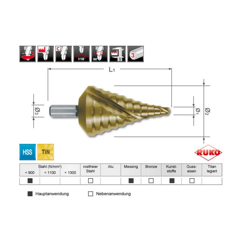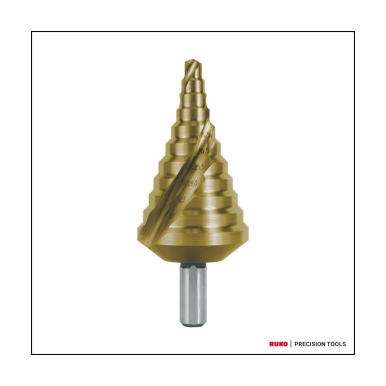 RUKO Stufenbohrer HSS-TiN, spiralgenutet mit Kreuzanschliff für metrische Kabelverschraubungen Größe Nr. 17