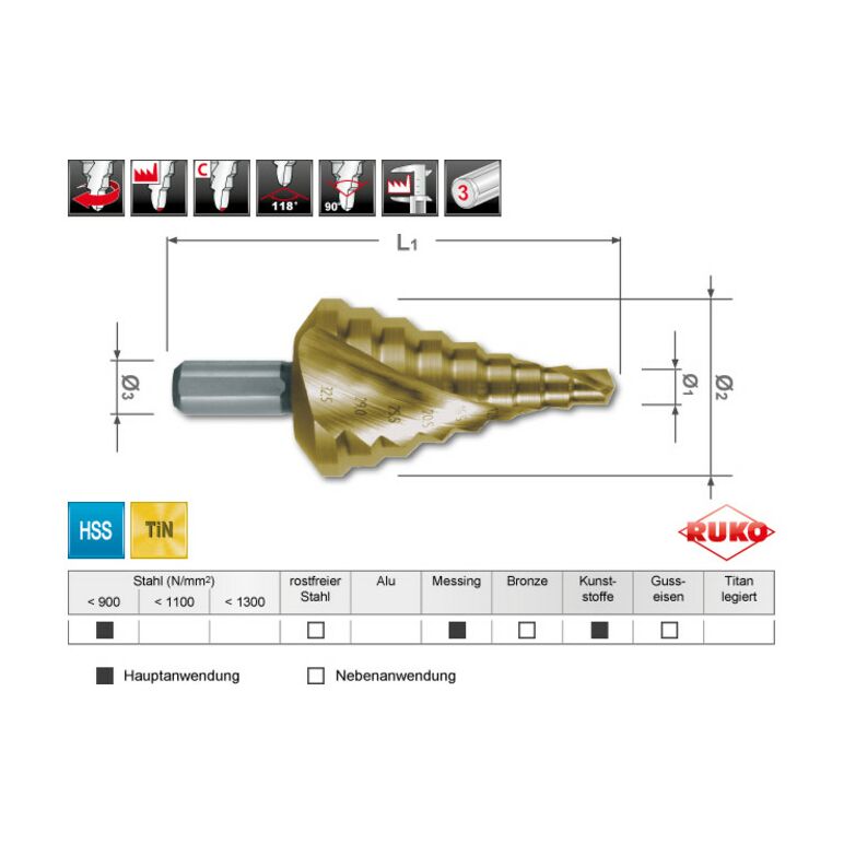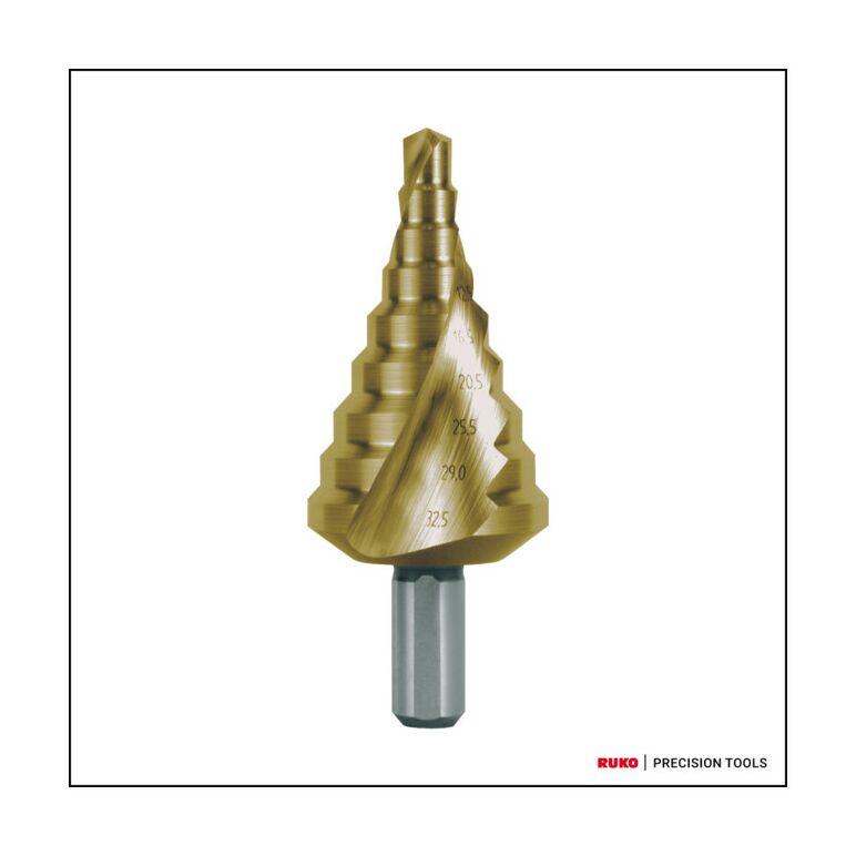 RUKO Stufenbohrer HSS-TiN, spiralgenutet mit Kreuzanschliff für metrische Kabelverschraubungen Größe Nr. 15