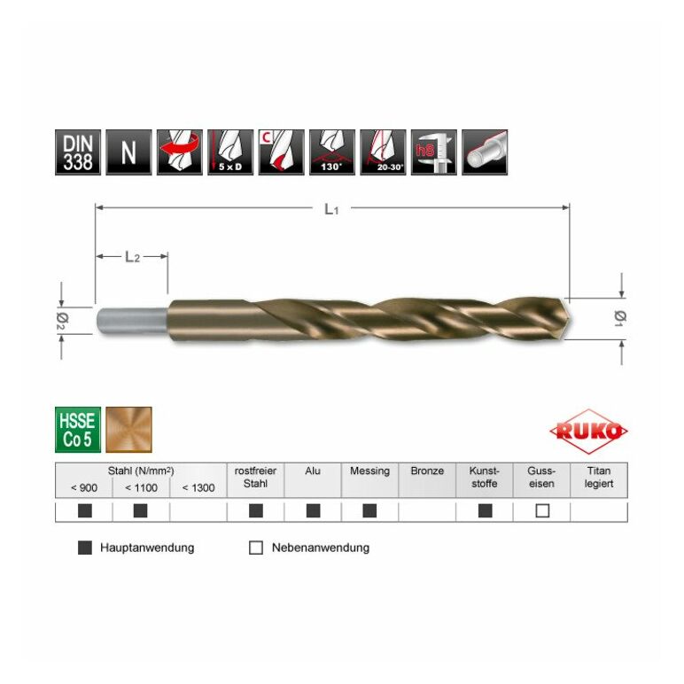 RUKO Spiralbohrer DIN 338 HSSE Co 5 Typ N mit abgesetztem Schaft D 11,5 mm L 142 mm