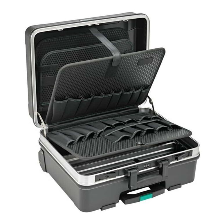 Eigenschaften:Mit TrolleyfunktionABS-KofferschalenErgonomisch geformter TragegriffMit anwendungsfreundlichem Teleskopgriff und 2 Inline RollenRobuster Aluminiumrahmen mit StoßkantenschutzZwei abschließbare Kippschlösser und Proficode-ZahlenschlossScharnierabdeckungVariable Bodenschale (2 Aluminium Trennstege, 4 Endkappen, 2 Mittelkappen)BodenfüsseAbdeckplatte mit 15 Einsteckfächern, Werkzeugtafel mit 22 EinsteckfächerSeparates Dokumentenfach im Deckel