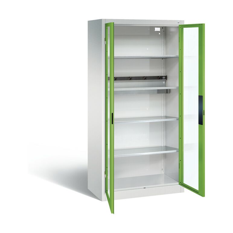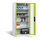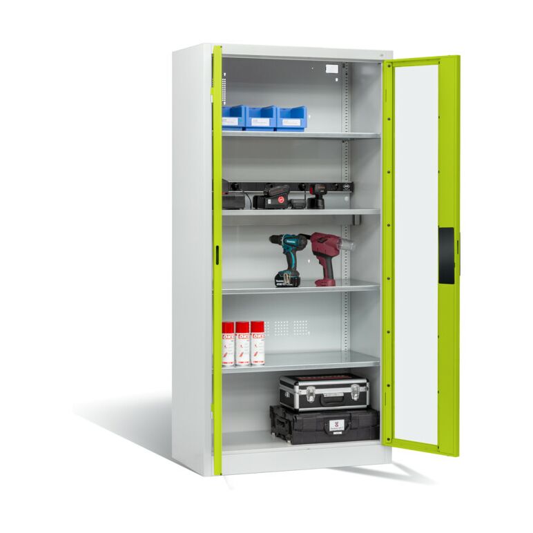 C+P Akku-Ladeschrank für 5 E-Werkzeuge, Sichtfenster, H1950xB930xT500mm, Viridingrün/Lichtgrau