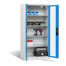 C+P Akku-Ladeschrank für 5 E-Werkzeuge, Sichtfenster, H1950xB930xT500mm, Lichtblau/Lichtgrau