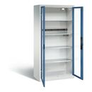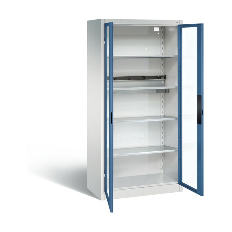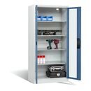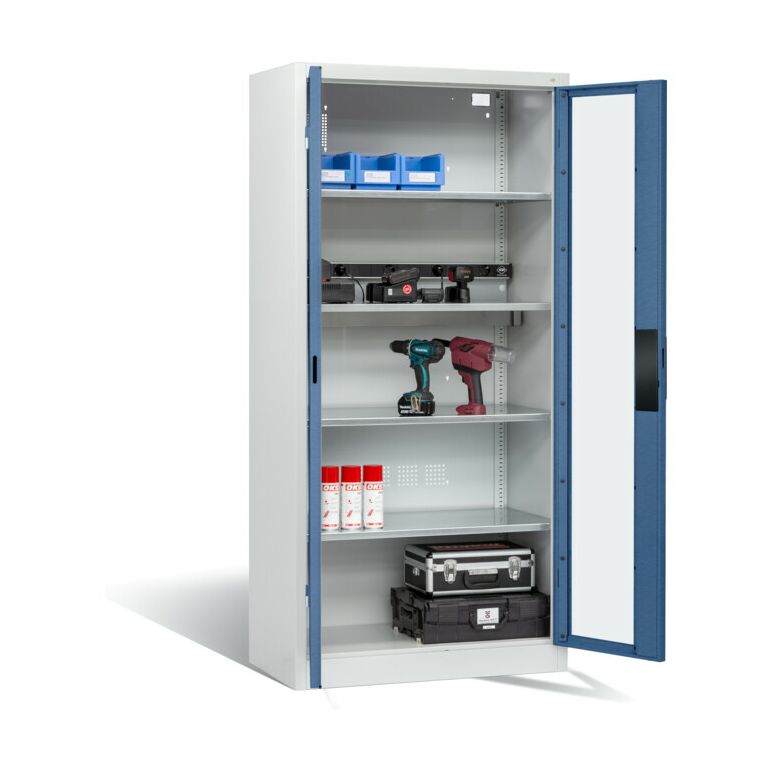C+P Akku-Ladeschrank für 5 E-Werkzeuge, Sichtfenster, H1950xB930xT500mm, Fernblau/Lichtgrau