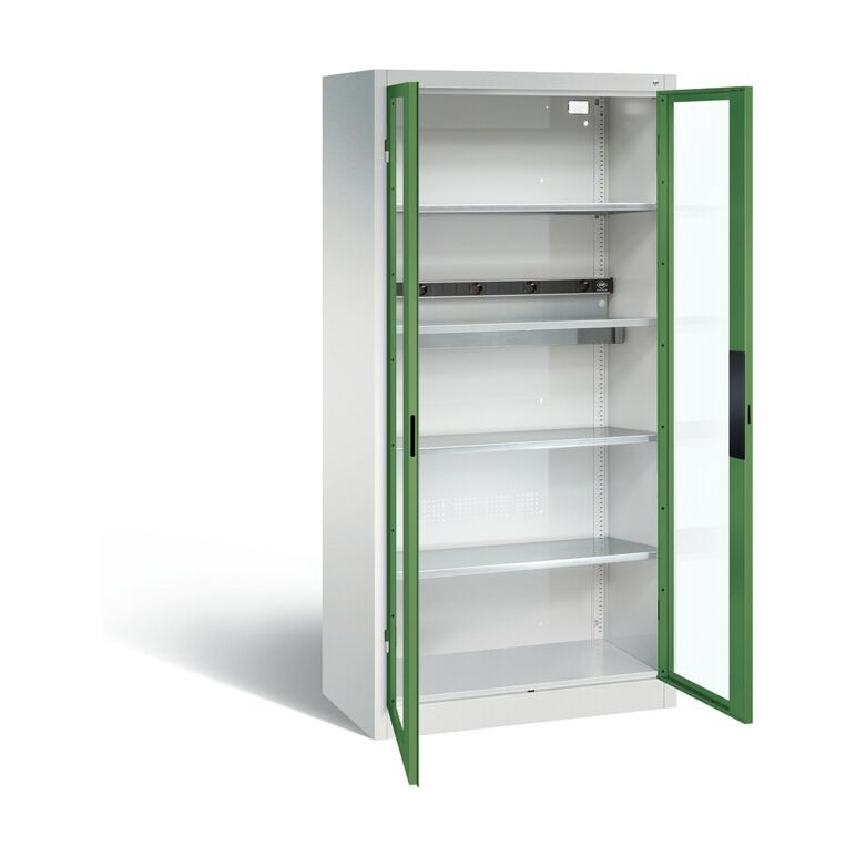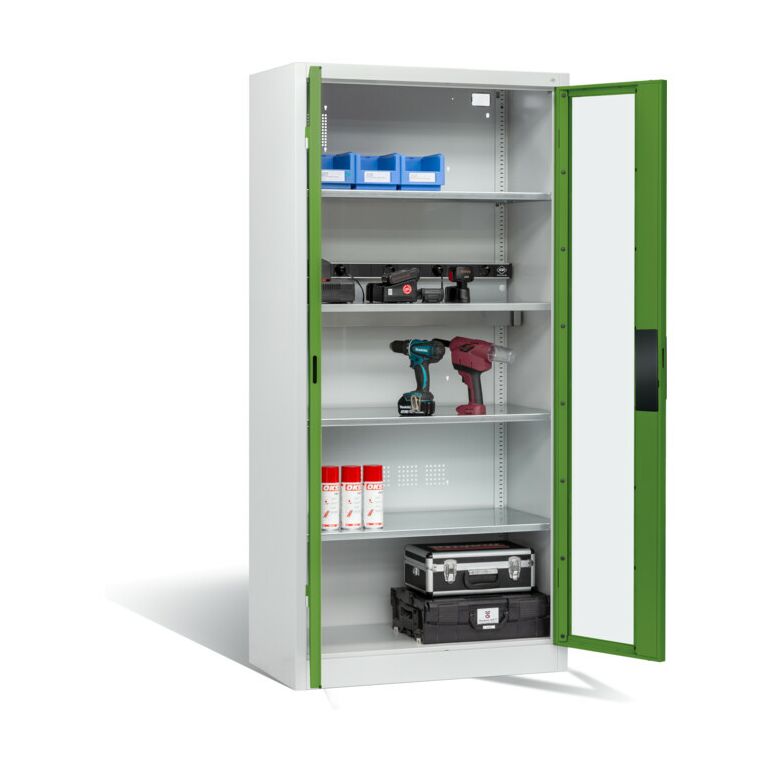 C+P Akku-Ladeschrank für 5 E-Werkzeuge, Sichtfenster, H1950xB930xT500mm, Resedagrün/Lichtgrau