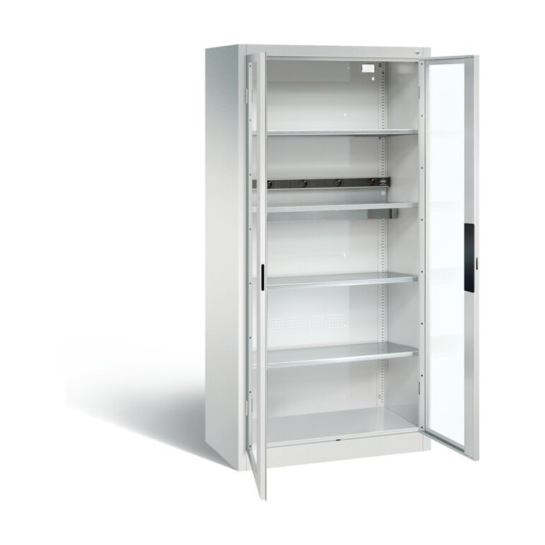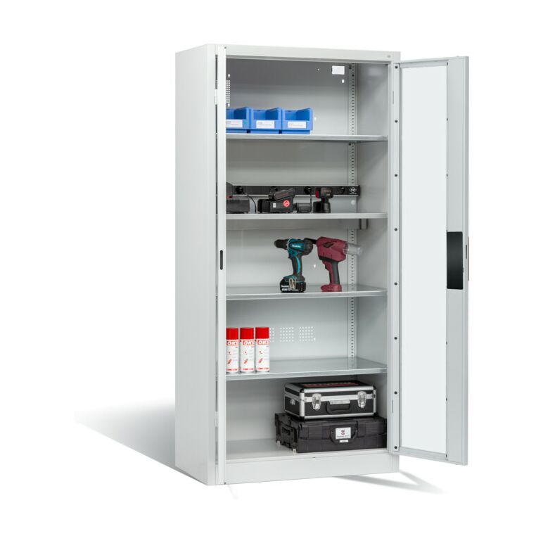 Akkuladeschrank Serie 89, als Werkzeugschrank geeignet.Eigenschaften:Korpus aus stabiler Stahlkonstruktion mit hochwertiger Einbrennbeschichtung für hohe UV-BeständigkeitMit Kunststoffgleitern als praktischer Schrank- und FußbodenschutzRückwand perforiert zur optimalen BelüftungTüren mit geschlossenen Seitenprofilen und verdeckten Schließstangen für höchste Stabilität und EinbruchsicherheitMit Sichtfenster aus Acrylglas für direkten EinblickTüraufhängung in außen liegenden Scharnieren mit großzügigem Öffnungswinkel ca. 180 GradZueinanderschlagend für gemeinsamen Verschluss1 Ergonomischer Muldengriff Ergo-Lock 4.0 für optimale Bedienungssicherheit und Verschleißfestigkeit3-Riegel-Verschluss mit Zylinderschloss und 2 Schlüsseln3 Einlegeböden aus Stahl verzinktTraglast 70 kg1 Elektro-Einlegeboden aus Stahl verzinkt mit hoher Traglast von 70 kg und 5-Fach-Streckdosenleiste mit 3 m Zuleitung inkl. intigrierter Wanne mit Belüftungsöffungen zur verdeckten Unterbringung von Netzteilen und KabelnMaße (H x B x T): 1950 x 930 x 500 mmKorpus: RAL 7035 LichtgrauTüren: RAL 7035 LichtgrauLieferumfang:1x C+P Akku-Ladeschrank für 5 E-Werkzeuge, Sichtfenster, H1950xB930xT500mm, Lichtgrau