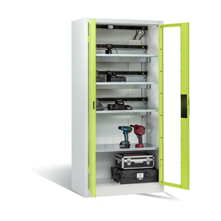 C+P Akku-Ladeschrank für 15 E-Werkzeuge, Sichtfenster, H1950xB930xT500mm, Viridingrün/Lichtgrau