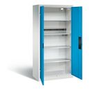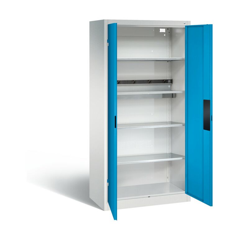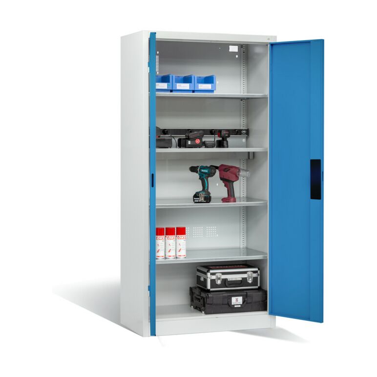 Akkuladeschrank Serie 89, als Werkzeugschrank geeignet.Eigenschaften:Korpus aus stabiler Stahlkonstruktion mit hochwertiger Einbrennbeschichtung für hohe UV-BeständigkeitMit Kunststoffgleitern als praktischer Schrank- und FußbodenschutzRückwand perforiert zur optimalen BelüftungTüren verstärkt für hohe Stabilität und verdeckten SchließstangenTüraufhängung in außen liegenden Scharnieren mit großzügigem Öffnungswinkel ca. 180 GradZueinanderschlagend für gemeinsamen Verschluss1 Ergonomischer Muldengriff Ergo-Lock 4.0 für optimale Bedienungssicherheit und Verschleißfestigkeit3-Riegel-Verschluss mit Zylinderschloss und 2 Schlüsseln3 Einlegeböden aus Stahl verzinktTraglast 70 kg1 Elektro-Einlegeboden aus Stahl verzinkt mit hoher Traglast von 70 kg und 5-Fach-Streckdosenleiste mit 3 m Zuleitung inkl. intigrierter Wanne mit Belüftungsöffungen zur verdeckten Unterbringung von Netzteilen und KabelnMaße (H x B x T): 1950 x 930 x 500 mmKorpus: RAL 7035 LichtgrauTüren: RAL 5012 LichtblauLieferumfang:1x C+P Akku-Ladeschrank für 5 E-Werkzeuge, H1950xB930xT500mm, Lichtblau/Lichtgrau