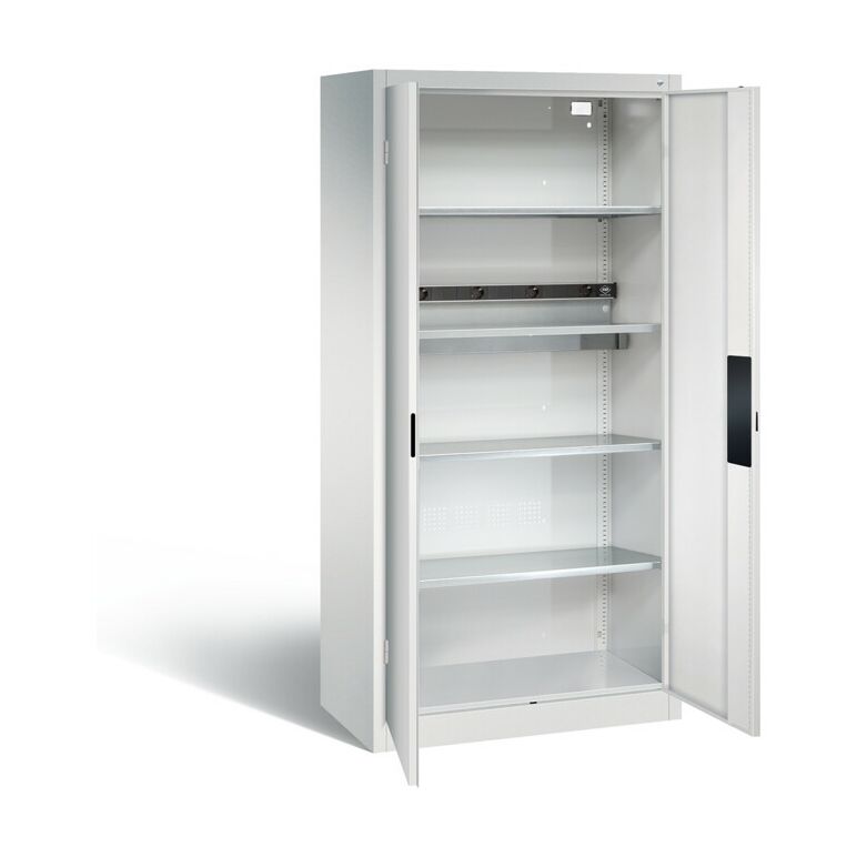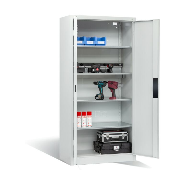 Akkuladeschrank Serie 89, als Werkzeugschrank geeignet.Eigenschaften:Korpus aus stabiler Stahlkonstruktion mit hochwertiger Einbrennbeschichtung für hohe UV-BeständigkeitMit Kunststoffgleitern als praktischer Schrank- und FußbodenschutzRückwand perforiert zur optimalen BelüftungTüren verstärkt für hohe Stabilität und verdeckten SchließstangenTüraufhängung in außen liegenden Scharnieren mit großzügigem Öffnungswinkel ca. 180 GradZueinanderschlagend für gemeinsamen Verschluss1 Ergonomischer Muldengriff Ergo-Lock 4.0 für optimale Bedienungssicherheit und Verschleißfestigkeit3-Riegel-Verschluss mit Zylinderschloss und 2 Schlüsseln3 Einlegeböden aus Stahl verzinktTraglast 70 kg1 Elektro-Einlegeboden aus Stahl verzinkt mit hoher Traglast von 70 kg und 5-Fach-Streckdosenleiste mit 3 m Zuleitung inkl. intigrierter Wanne mit Belüftungsöffungen zur verdeckten Unterbringung von Netzteilen und KabelnMaße (H x B x T): 1950 x 930 x 500 mmKorpus: RAL 7035 LichtgrauTüren: RAL 7035 LichtgrauLieferumfang:1x C+P Akku-Ladeschrank für 5 E-Werkzeuge, H1950xB930xT500mm, Lichtgrau