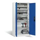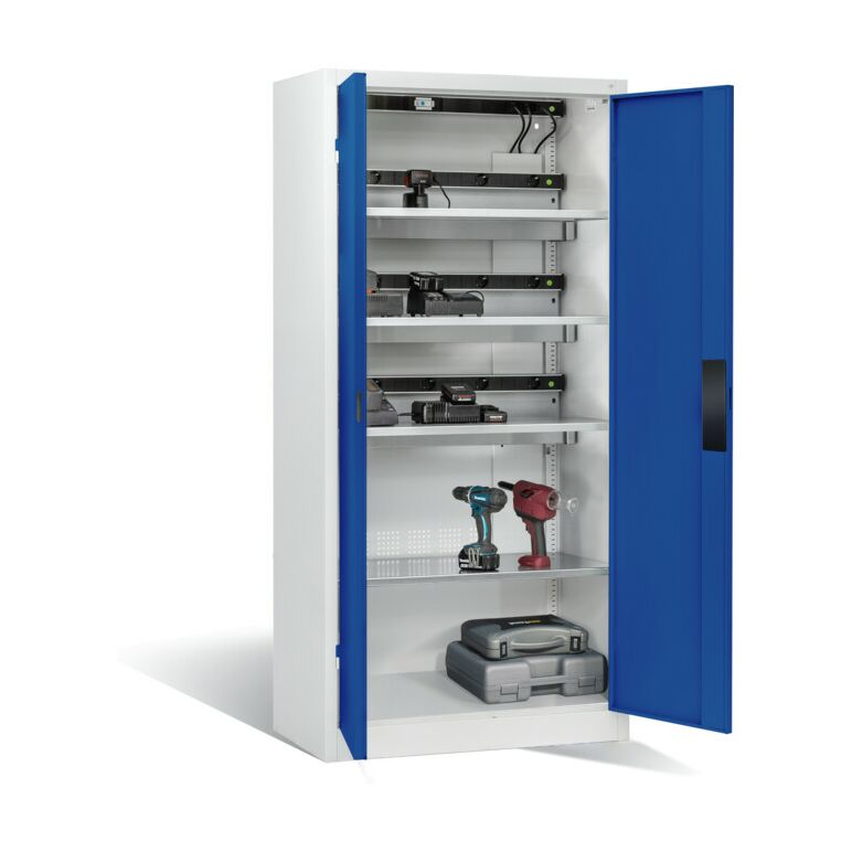 C+P Akku-Ladeschrank für 15 E-Werkzeuge, H1950xB930xT500mm, Enzianblau/Lichtgrau