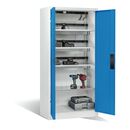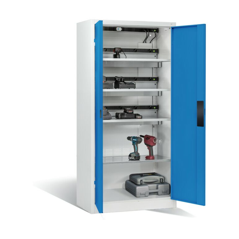 C+P Akku-Ladeschrank für 15 E-Werkzeuge, H1950xB930xT500mm, Lichtblau/Lichtgrau