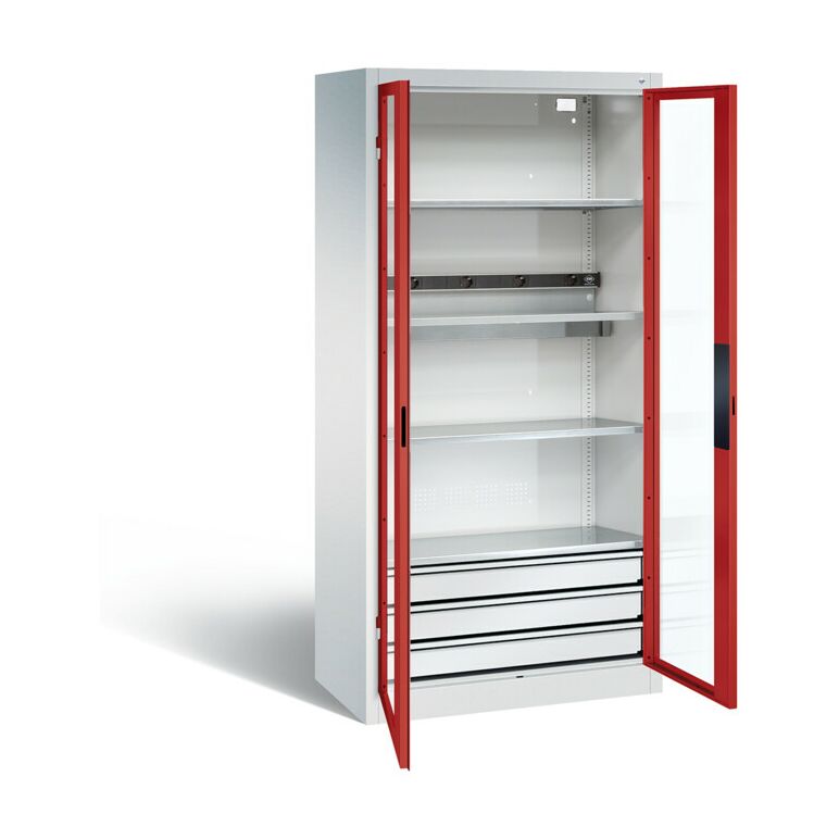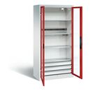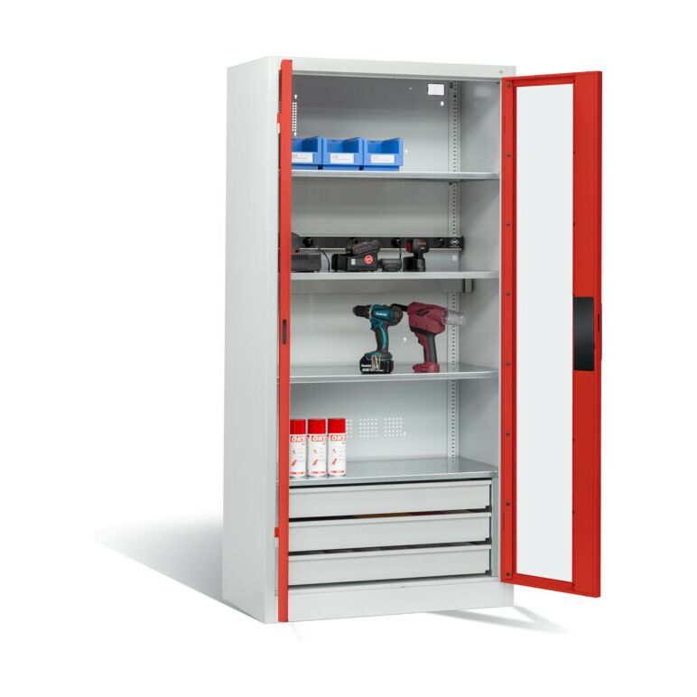 C+P Akku-Ladeschrank für 5 E-Werkzeuge, 3 Schubladen, Sichtfenster, H1950xB930xT500mm, Feuerrot/Lichtgrau