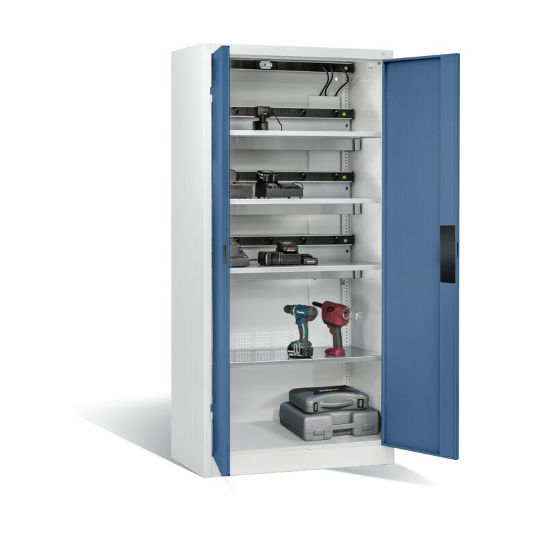 C+P Akku-Ladeschrank für 15 E-Werkzeuge, H1950xB930xT500mm, Fernblau/Lichtgrau