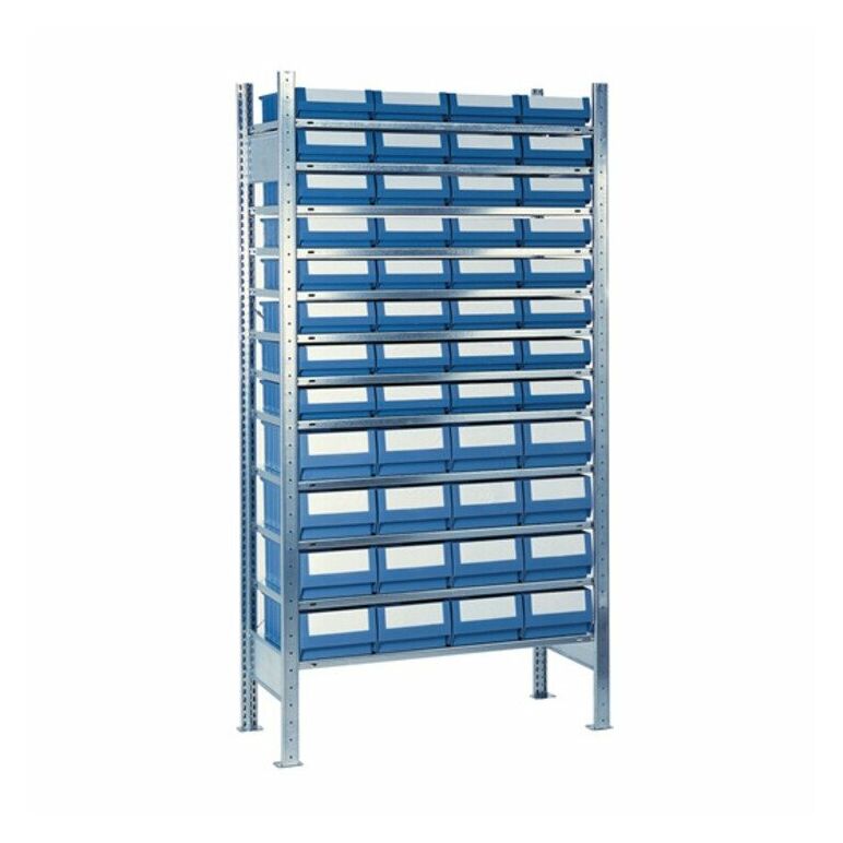 mit Regalkästen · einfache und schnelle Steckmontage mit vormontierten verzinkten Rahmen · Fachböden verzinkt mit verstärktem Kastenprofil, H 25 mm, höhenverstellbar im 25-mm-Raster · Tragfähigkeit pro Fachboden 150 kg · Feldlast 1300 kg Regalmaße: H 2000 x B 1000 x T 300/400/500 mm Regalaußenmaße: Grundregal + 60 mm, Anbauregal + 6 mm, Tiefe + 36 mm Weitere technische Eigenschaften: · Anzahl Regalkästen x Gr.: 32 x 5, 16 x 6 · Ausstattung: Stahlböden · Feldlast: 1300kg