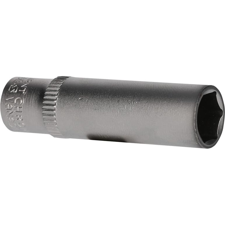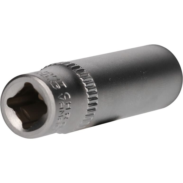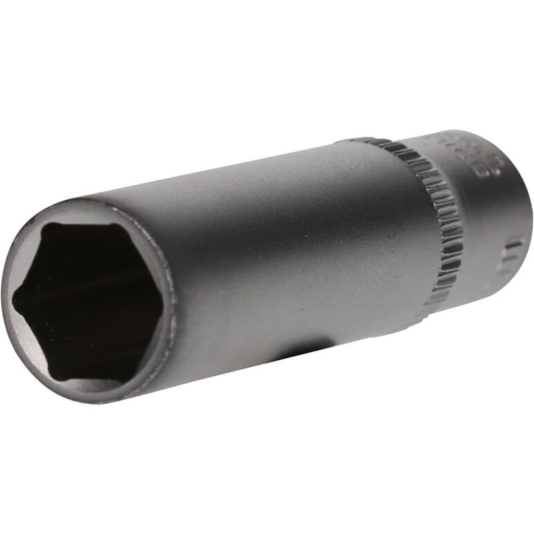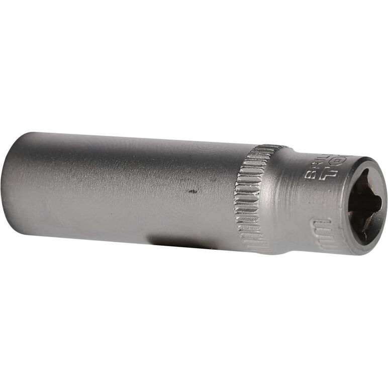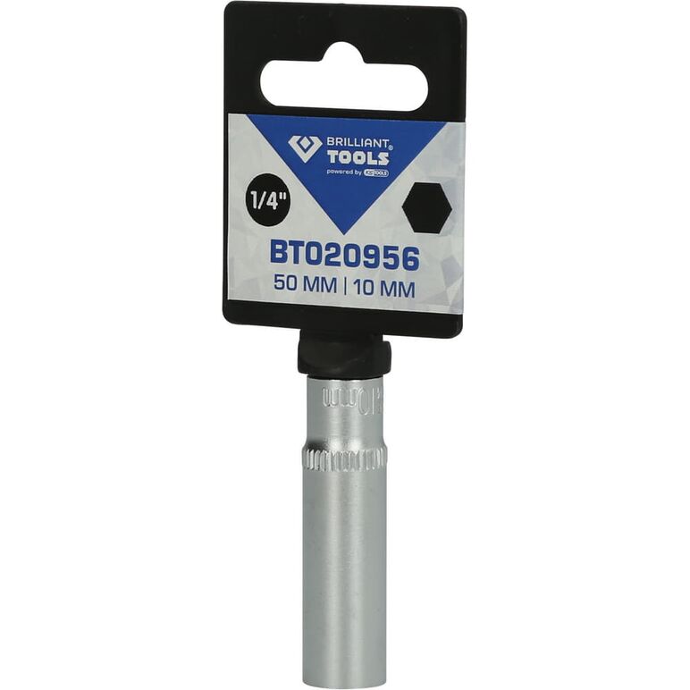 Die BRILLIANT TOOLS Sechskant-Stecknuss BT020956 ist nach DIN 3124 gefertigt. Der lange metrische Einsatz hat einen 1/4" (6,3 mm) Innenvierkant-Antrieb welcher nach DIN 3120 gefertigt wurde. Die Schlüsselweite des Sechskants ist 10 mm. Die Sechskant-Stecknuss hat eine Gesamtlänge von 50 mm. Die Oberfläche ist an der Antriebsseite und an der Innensechskantseite matt verchromt, diese ist durch eine Längsrändelung getrennt.