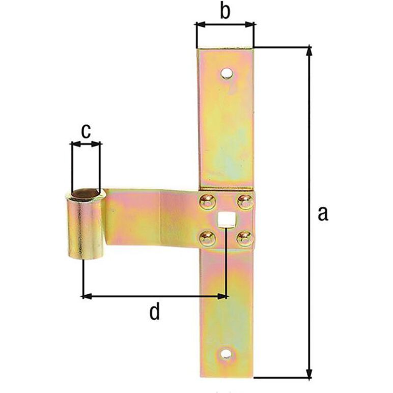 Fensterladen-Mittelband gerade ● Rollenbreite: 35 mm ● Rollenstärke: 4 mm ● Materialstärke: 3,00 mm ● Oberfläche: galvanisch gelb verzinkt weitere Info's: Maß a: 200 mm Maß b: 30 mm Maß c: 13 mm Maß d: 75 mm Marke: Alberts