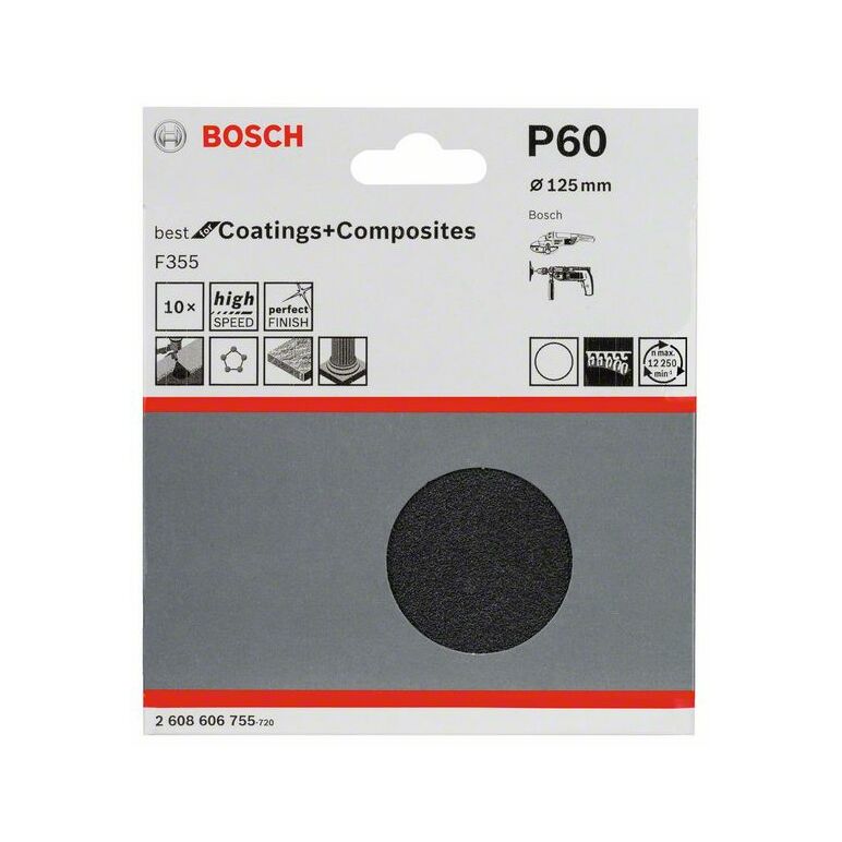 Bosch Schleifblatt Papier F355, 125 mm, 60, ungelocht, Klett, 10er-Pack (2 608 606 755)