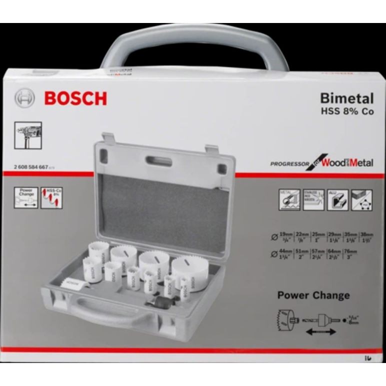 Ein schneller und sauberer Arbeitsfortschritt ist mit dem Bosch BIM Progressor PC Uni Lochsägen Set kein Thema mehr. Die Zahnleiste bietet eine optimale Schneidleistung und einen schnellen Spanauswurf. Des Weiteren ist das Material aus Bi-Metall-HSS mit 8% Kobald Legierung. So ist eine enorme Widerstandsfähigkeit und Langlebigkeit gegeben. Es ist für Weichholz, Trockenbauwände, Rohre und Profile aus Metall, Nichteisenmetalle sowie Kunststoff geeignet. Die Bosch Lochsägen sind mit dem Power Change Plus-Schnellspann-Adapter zu verwenden, der problemlos auf verschiedene Bohr- und Schlagbohrschrauber passt und dadurch das System universell anwendbar ist. Bosch ist ein Hersteller mit langer Tradition. Ein hoher Qualitätsstandard zeichnet das Unternehmen aus.