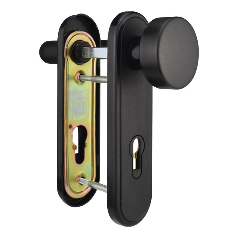 rund · mit 2 Befestigungsschrauben · Lochung PZ · Entfernung 72 mm · Vierkant 9 mm · Drücker fest/drehbar gelagert · Schilder mit Stahl-Unterplatten und Kunststoffblenden · für Türstärke 40-57 mm · DIN links / rechts verwendbar · Farbe schwarzWeitere technische Eigenschaften:· Vierkant: 9mm