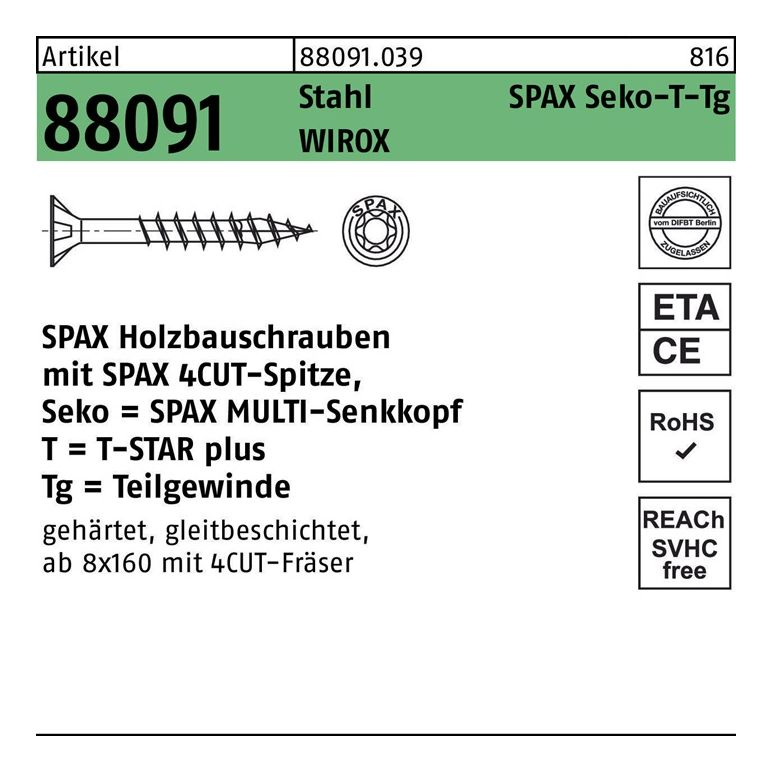 Artikel 88091 St. SPAX Seko-T-Tg Oberfläche WIROX SPAX Holzbauschrauben mit Spitze · SPAX MULTI-Senkkopf · Teilgewinde · T-STAR - Abmessung: 10 x 200/ 80-T50 VE=S (50 Stück)Weitere technische Eigenschaften:· Gruppencode 88091.039· Normart REYHER-Artikel 88091· Oberfläche WIROX