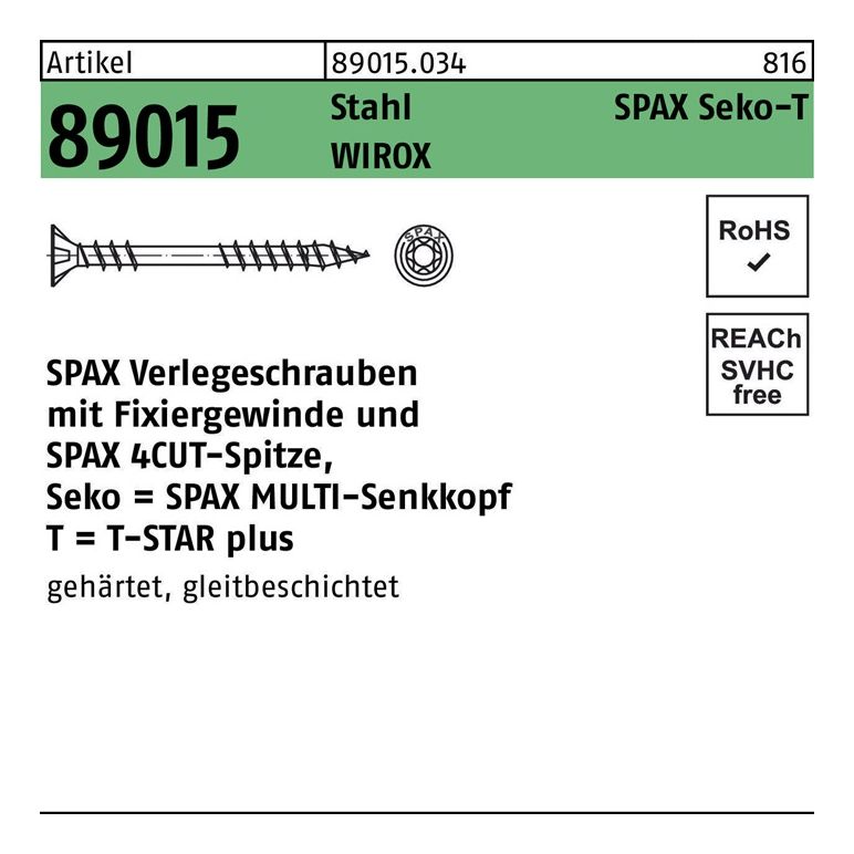 Artikel 89015 Stahl SPAX Seko-T Oberfläche WIROX SPAX Verlegeschrauben mit Fixiergewinde und Spitze · Senkkopf · T-STAR - Abmessung: 4,5 x 60 -T20 VE=S (500 Stück)Weitere technische Eigenschaften:· Gruppencode 89015.034· Normart REYHER-Artikel 89015· Oberfläche WIROX
