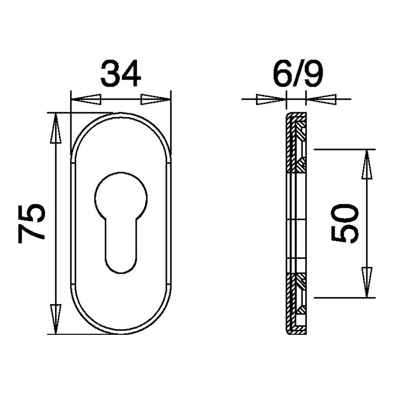Schlüsselrosette zum Aufschieben für Rahmentüren· mit Bajonettverschluss · Lochung PZ · Höhe 75 mm · Breite 34 mm · unsichtbare Verschraubung · Lieferung ohne SchraubenWeitere technische Eigenschaften:· Zylinderabdeckung: ohne ZA· Farb-Nr.: F1