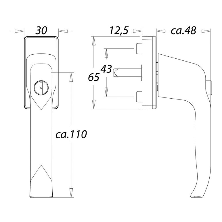 abschließbar · mit Druckzylinder und 1 Schlüssel (immer gleichschließend) · mit Rasterung · Nocken-Ø 10 mm · 7 mm VierkantstiftWeitere technische Eigenschaften:· Grifflänge: 110mm· Nocken-Ø: 10mm· Lochabstand: 43mm· Sockelstärke: 12,5mm· Vierkant: 7mm