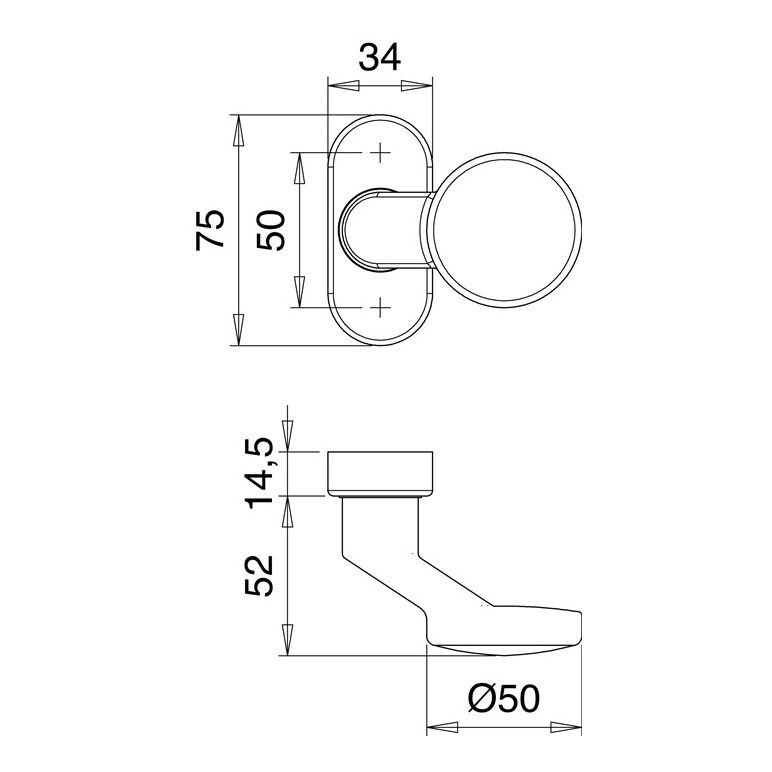 für Rahmentüren · schräg, auf ovaler Rosette · mit unsichtbarer Befestigung · Höhe 75 mm · Breite 34 mm · Stärke 14,5 mm · Schraublochabstand 50 mm · fest oder fest/drehbar (federnd gelagert) · DIN links / rechts · Lieferung ohne Stift und SchraubenWeitere technische Eigenschaften:· Befestigungssystem: verdeckte Verschraubung· Anschlagrichtung: DIN links / rechts· Farb-Nr.: EST· Knopfdurchmesser: 50mm