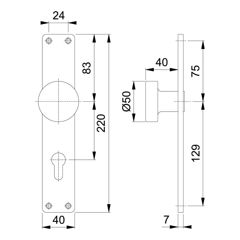 für Abschlusstüren · mit Befestigungsschrauben · Lochung PZ · Entfernung 72 mmWeitere technische Eigenschaften:· Schildstärke: 7 mm· Befestigungsart: sichtbare Verschraubung· Ausführung: Knopf gerade· Knopftiefe: 40mm