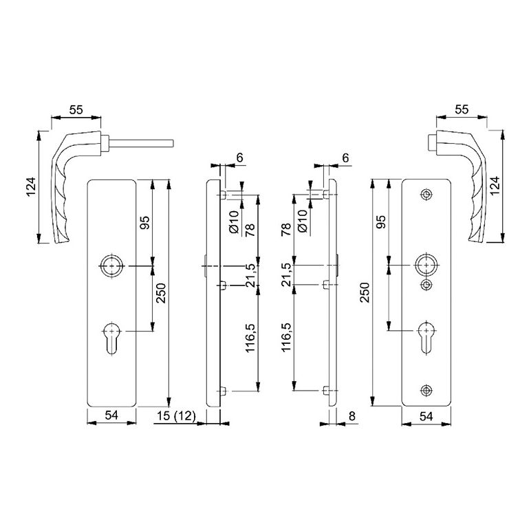 Drückergarnitur für Abschlusstüren · Zamak-Unterkonstruktion im Außen- und Innenschild · Profilstift-Verbindung · sichtbare Verschraubung · Lochung PZ · einschließlich Befestigungsmaterial · Aussenschild Randhöhe 12 mm · DIN links / rechts · Widerstandsklasse ES 0Weitere technische Eigenschaften:· Breite: 54mm· Länge: 250mm· Abdeckung: ohne Zylinderabdeckung· Schildstärke: 12 mm