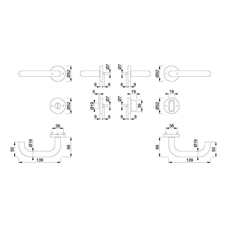 Innentür-Rosetten-Garnitur · Türgriffe mit Profilstift-Verbindung (8 mm Vierkant) für Türstärke 38-42 mm und Rückholfeder · Rosetten mit Stütznocken unsichtbar verschraubt · Anschlagrichtung DIN links / rechtsWeitere technische Eigenschaften:· Befestigungssystem: Profilstift· Nockenabstand: 38mm