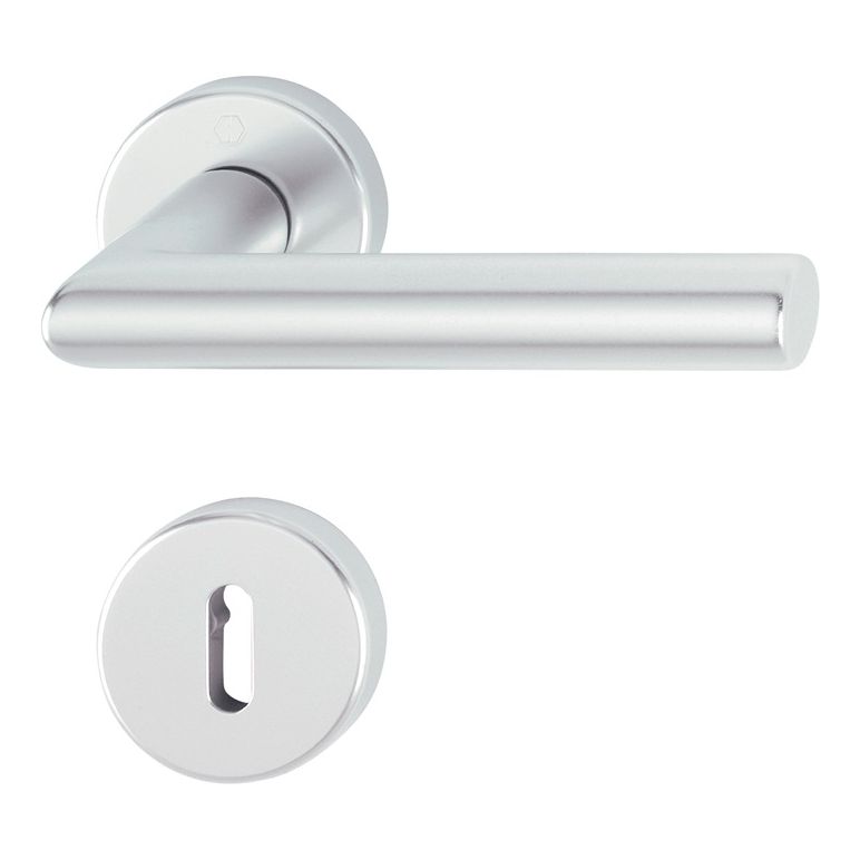 Innentür-Rosetten-Garnitur geprüft nach DIN EN 1906 ( Gebrauchs-Kategorie Klasse 3) · Aluminium, F1 / naturfarbig · Türgriffe mit Schnellstift-Verbindung (mit 8 mm Vollstift) für Türstärke 37-42 mm · Rosetten mit Kunststoff-Unterkonstruktion, Rückholfeder und Stütznocken · verdeckte, durchgehende Verschraubung mit selbstschneidenden Gewindeschrauben · Anschlagrichtung DIN links / rechtsWeitere technische Eigenschaften:· Befestigungssystem: Schnellstift· Nockenabstand: 38mm