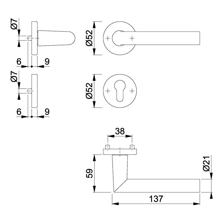 Innentür-Rosetten-Garnitur geprüft nach DIN EN 1906 ( Gebrauchs-Kategorie Klasse 3) · Aluminium, F1 / naturfarbig · Türgriffe mit Schnellstift-Verbindung (mit 8 mm Vollstift) für Türstärke 37-42 mm · Rosetten mit Kunststoff-Unterkonstruktion, Rückholfeder und Stütznocken · verdeckte, durchgehende Verschraubung mit selbstschneidenden Gewindeschrauben · Anschlagrichtung DIN links / rechtsWeitere technische Eigenschaften:· Befestigungssystem: Schnellstift· Nockenabstand: 38mm