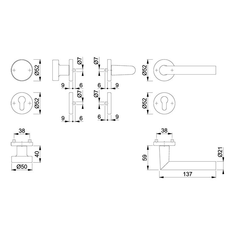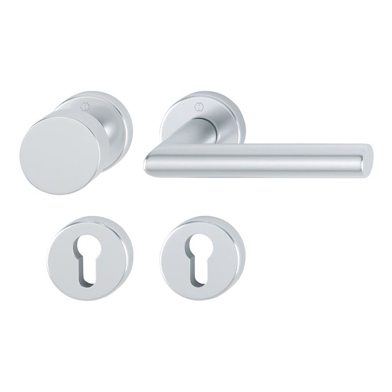 Innentür-Rosetten-Garnitur geprüft nach DIN EN 1906 ( Gebrauchs-Kategorie Klasse 3) · Aluminium, F1 / naturfarbig · Türgriffe mit Schnellstift-Verbindung (mit 8 mm Vollstift) für Türstärke 37-42 mm · Rosetten mit Kunststoff-Unterkonstruktion, Rückholfeder und Stütznocken · verdeckte, durchgehende Verschraubung mit selbstschneidenden Gewindeschrauben · Anschlagrichtung DIN links / rechtsWeitere technische Eigenschaften:· Befestigungssystem: Schnellstift· Nockenabstand: 38mm