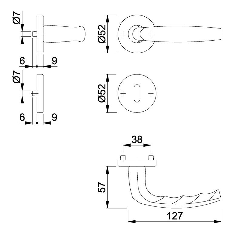 Innentür-Rosetten-Garnitur: geprüft nach DIN EN 1906 (Gebrauchs-Kategorie Klasse 3) · Türgriffe mit 8 mm Schnellstift-Verbindung (mit Vollstift) für Türstärke 37 - 42 mm · Griff- und Schlüsselrosetten mit Kunststoff-Unterkonstruktion · Rückholfeder und Stütznocken · verdeckte, durchgehende Verschraubung mit selbstschneidenden Gewindeschrauben · Drückergarnitur · Anschlagrichtung DIN links / rechtsWeitere technische Eigenschaften:· Befestigungssystem: Schnellstift· Nockenabstand: 38mm