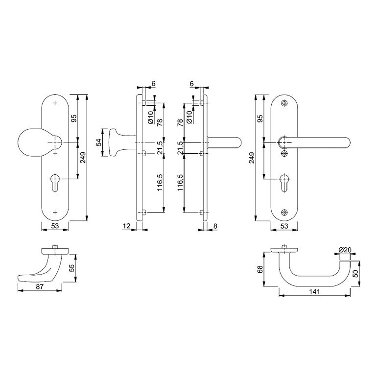 Wechselgarnitur für Abschlusstüren · Zamak-Unterkonstruktion im Außen- und Innenschild · mit feststehendem Knopf · Profilstift-Verbindung · sichtbare Verschraubung · Lochung PZ · einschließlich Befestigungsmaterial · Außenschild-Randhöhe 12 mm · Entfernung 72 mm · F69 Edelstahl matt · DIN links / rechts · Widerstandsklasse ES 0Weitere technische Eigenschaften:· Breite: 54mm· Länge: 250mm· Abdeckung: ohne Zylinderabdeckung· Schildstärke: 12 mm
