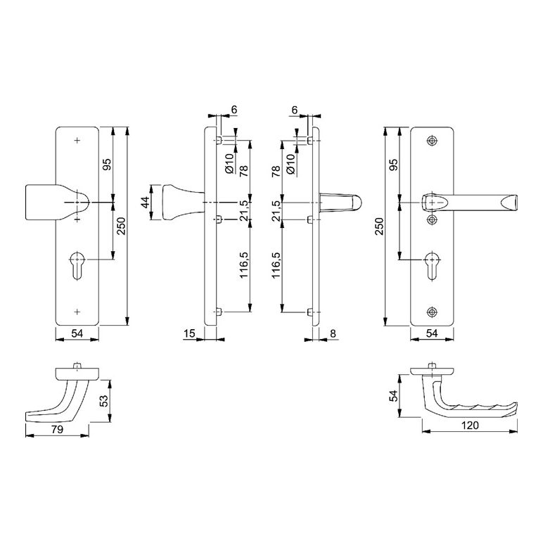für Abschlusstüren · Zamak-Unterkonstruktion im Außen- und Innenschild · mit feststehendem Knopf · FDW-Profilstift-Verbindung · sichtbare Verschraubung · Lochung PZ · Außenschild-Randhöhe 12 mm · Randhöhe Schild: 15 mm · Widerstandsklasse ES 0Weitere technische Eigenschaften:· Breite: 54mm· Länge: 250mm· Abdeckung: ohne Zylinderabdeckung· Schildstärke: 15 mm