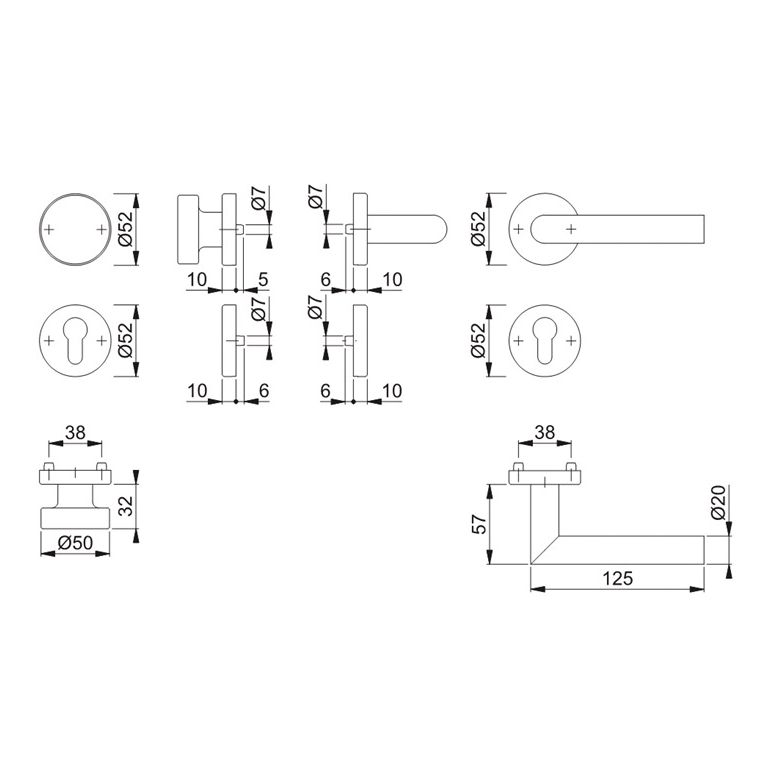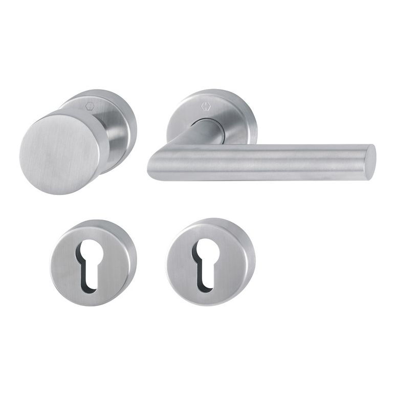 Rosetten-Garnitur mit Schlüsselrosetten für Innentüren · geprüft nach DIN EN 1906: 47-0150A und PIVCERTPlus (1.000.000 Prüfzyklen), Objekt-Garnitur (Gebrauchs-Kategorie Klasse 4) · Lagerung: Türgriffe fest/drehbar (Wechselgarnitur: außen Knopf fest), Rückholfedern, HOPPE-Steckgriff-Verbindung mit Kugel-Arretierung Sertos®, wartungsfreie Gleitlager · Verbindung: HOPPE-Profilvollstift (Drückergrt.) / HOPPE-FDW-Profilvollstift (Wechselgrt.), gehärtet · Unterkonstruktion: Griff-/Knopfrosetten Stahl, Schlüsselrosetten Kunststoff, Stütznocken · Befestigung: verdeckt, durchgehend · Griff-/Knopfrosetten Gewindeschrauben M5 · Schlüsselrosetten Mehrzweckschrauben, wechselseitig · TS 40 - 45 mmWeitere technische Eigenschaften:· Befestigungssystem: Sertos®· Nockenabstand: 38mm