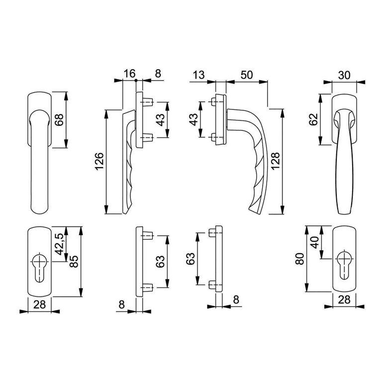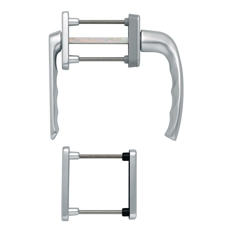 Rosetten-Garnitur · Außengriff mit kurzem Hals fest verstiftet · inkl. drei Schraubensets zur Überbrückung von unterschiedlichen Türdicken · verdeckte Verschraubung · Vierkant 7 mmWeitere technische Eigenschaften:· Farb-Nr.: F1