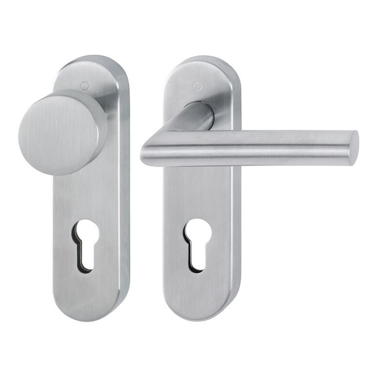 Kurzschild-Garnitur für Innentüren · geprüft nach DIN EN 1906: 47-0150A und PIVCERTPlus (1.000.000 Prüfzyklen), Objekt-Garnitur (Gebrauchs-Kategorie Klasse 4) · Lagerung: Türgriffe fest/drehbar (Wechselgarnitur: außen Knopf fest), Rückholfedern, HOPPE-Steckgriff-Verbindung mit Kugel-Arretierung Sertos®, wartungsfreie Gleitlager · Verbindung: HOPPE-Profilvollstift (Drückergrt.) / HOPPE-FDW-Profilvollstift (Wechselgrt.), gehärtet · TS 40 - 45 mm · Unterkonstruktion: Stahl, Stütznocken · Befestigung: verdeckt, durchgehend, Gewindeschrauben M5Entfernung 72 mmWeitere technische Eigenschaften:· Befestigungsart: Sertos®· Entfernung: 72mm· Vierkant: 8mm